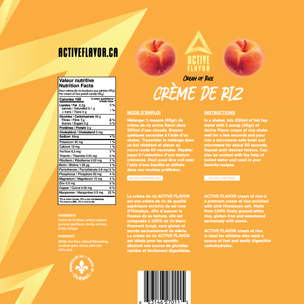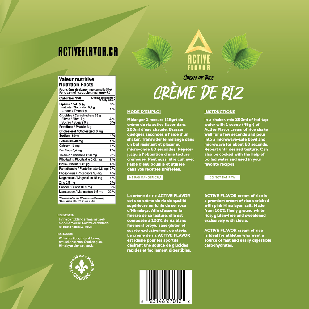 With its soft and creamy taste, Active Flavor cream of rice is often used by many athletes for its intake of fast and easily digestible carbohydrates. This rice cream is made from 100% finely ground rice to obtain a fine gluten-free flour. Sweeten with stevia without artificial flavor.