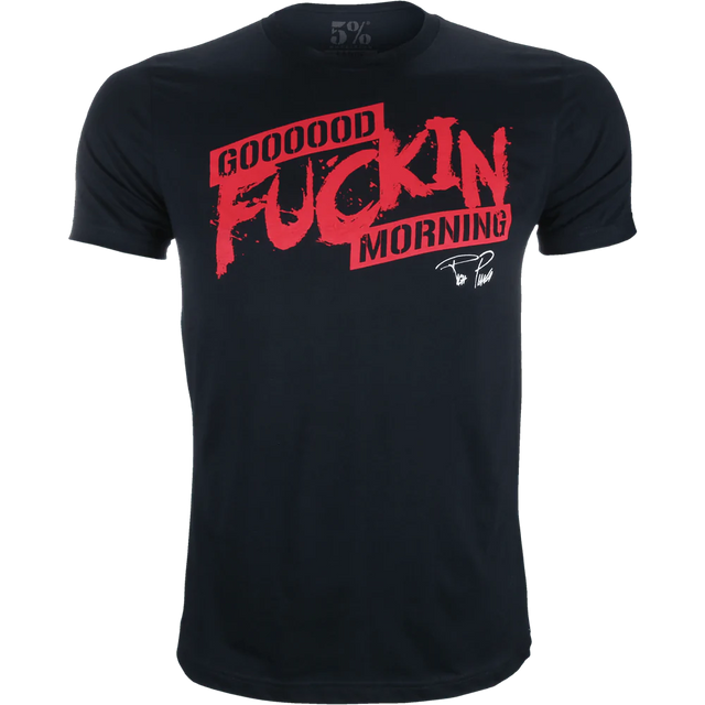 Features "Good Fuckin' Morning" on the front in signature 5% red; Rich Piana's signature underneath; and a big red "5%" on the back