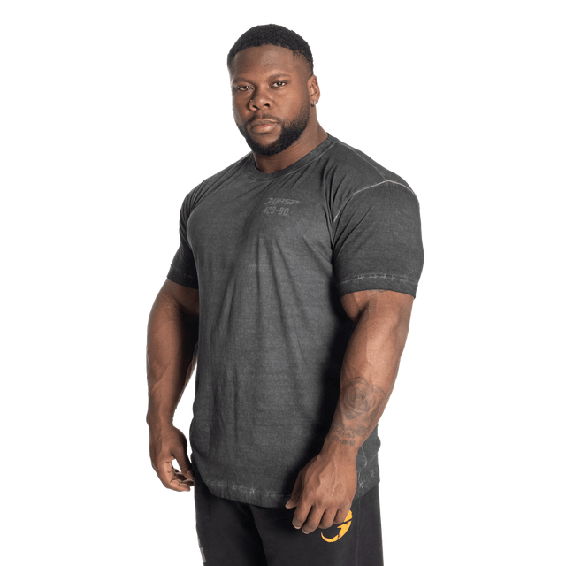 Simple, uncompromising and rough. The Standard Issue Tee is a light weight, dirty oil dyed tee that has been treated by hand for a unique look. The sleeves are cut at the top of the biceps to show off the results of your hours in the gym.