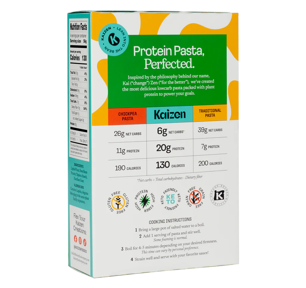 Indulge in delicious low carb, high protein, and keto friendly pasta with Kaizen. With 100% plant protein and fiber, it's not just tasty but also filling. Made in the USA, gluten-free and Kosher Certified, each 8oz carton contains 4 servings - perfect for any meal. Kaizen Keto High Protein Cavatappi Pasta is a nutritious and delicious option for keto and low-carb diets. Made in a helical tube shape, it provides 20g of protein per serving. Also known as "scoobi doo" pasta, it is a versatile ingredient for various recipes.