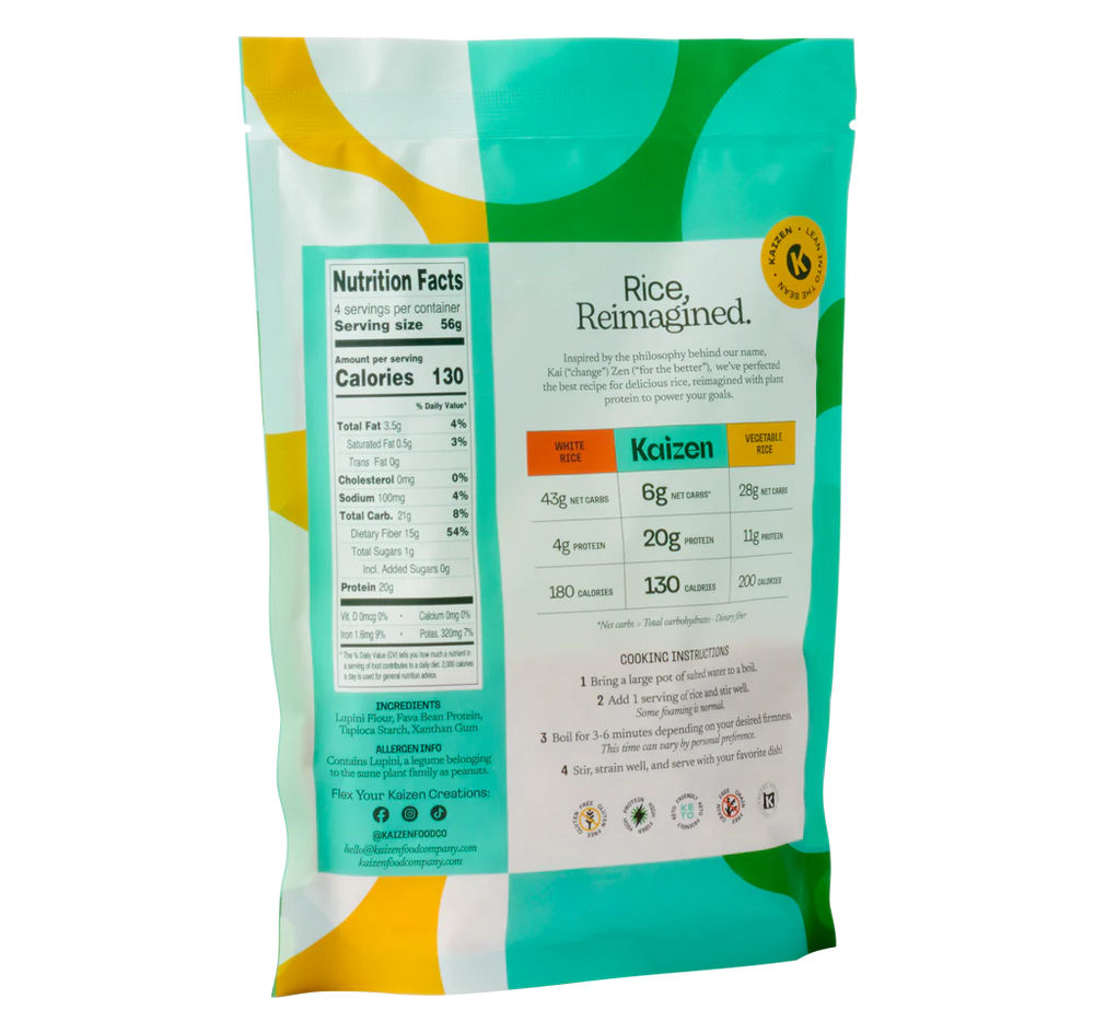 Craft delicious rice-based dishes with Kaizen Keto High Protein Rice! Our low carb, keto, high protein rice is packed with 100% plant protein and fiber, making it a filling and nutritious option. Enjoy gluten-free, grain-free, soy-free, and Kosher-certified rice that is made in the USA. Each 8oz carton contains 4 servings with only 6 net carbs and 20 grams of protein per 2oz serving. Elevate your meals with Kaizen!