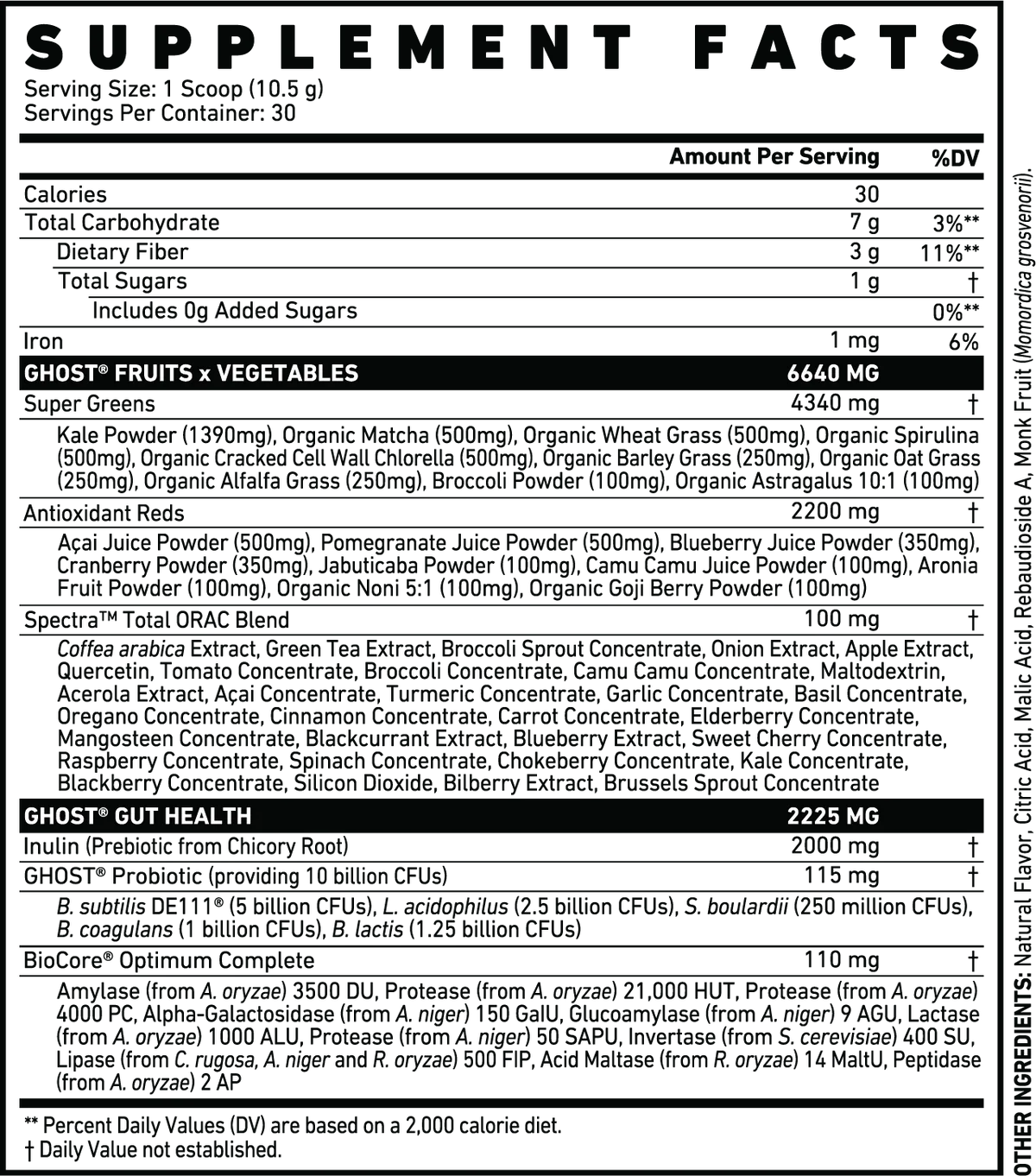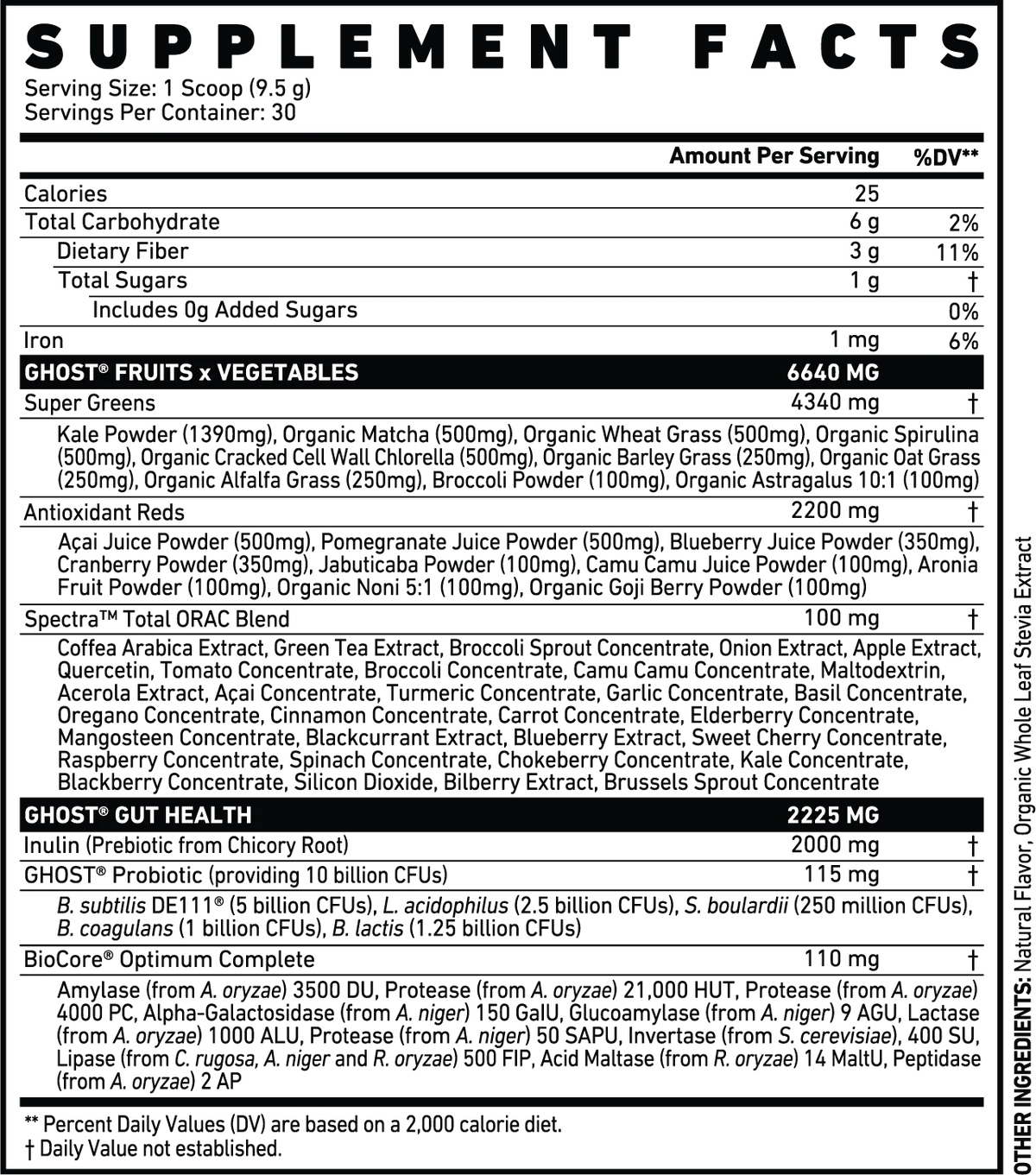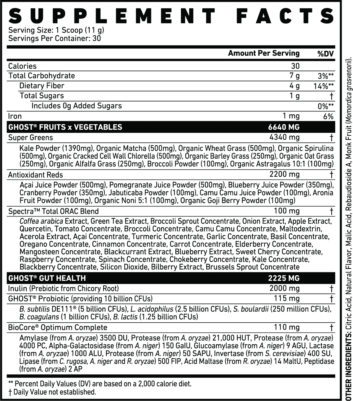 Get your daily dose of greens and reds with GHOST® GREENS. Packed with 19 individual sources, including 100mg of Spectra™, prebiotics, and 10 billion CFUs probiotics, this superfood powder also contains BioCore® Optimum complete digestive enzymes. Plus, with every unit sold, one tree is planted through our partnership with ONE TREE PLANTED.