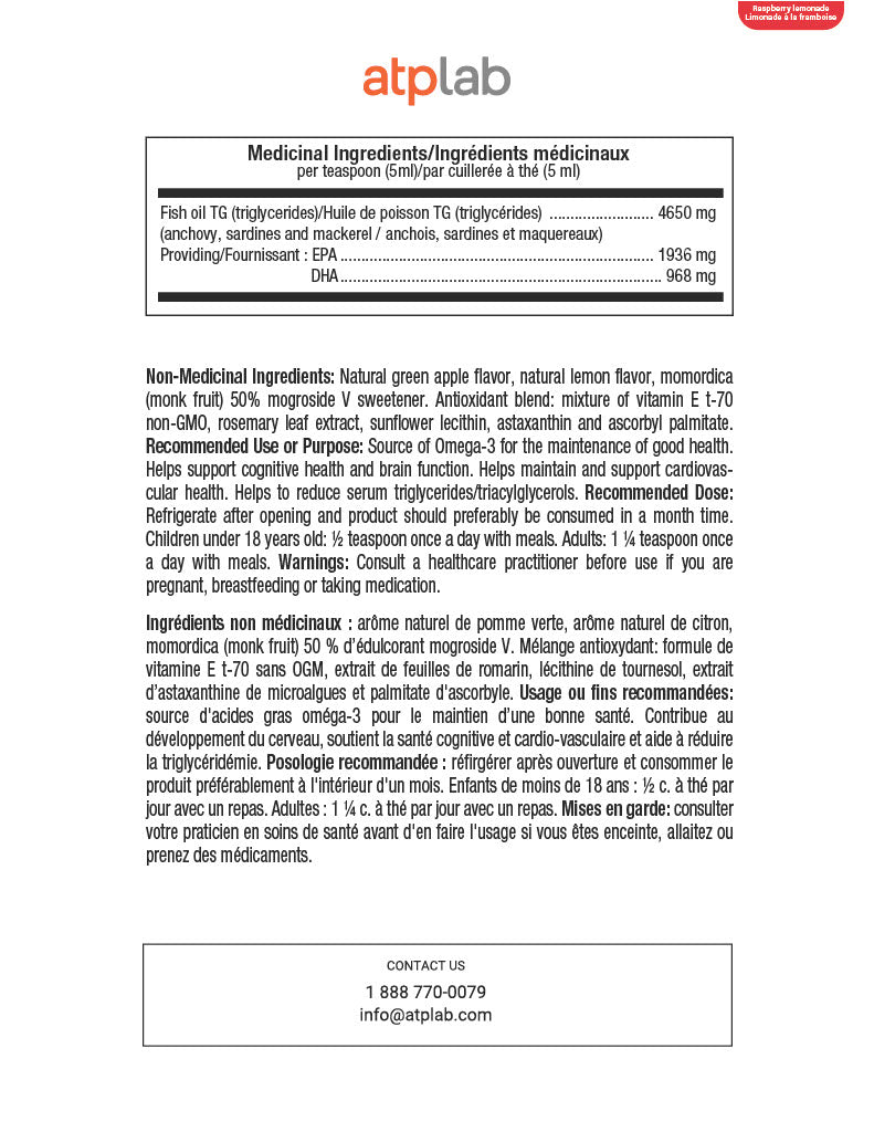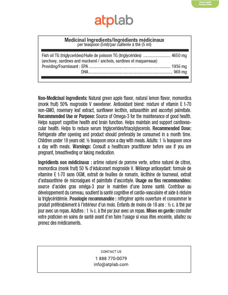 Ultra-concentrated triglyceride form of Omega-3 formula 4650 mg of Omega-3 TG per 5ml * (2088 mg EPA, 1044 mg DHA)