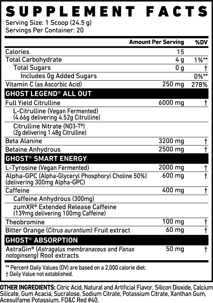 Unleash your full potential with Ghost Legend All Out Pre Workout. Experience intense, focused workouts that leave you feeling fulfilled and energized. With Ghost Legend, you'll achieve the ultimate mind-muscle connection and conquer every session, every day. Don't settle for less, go all out with Ghost Legend.