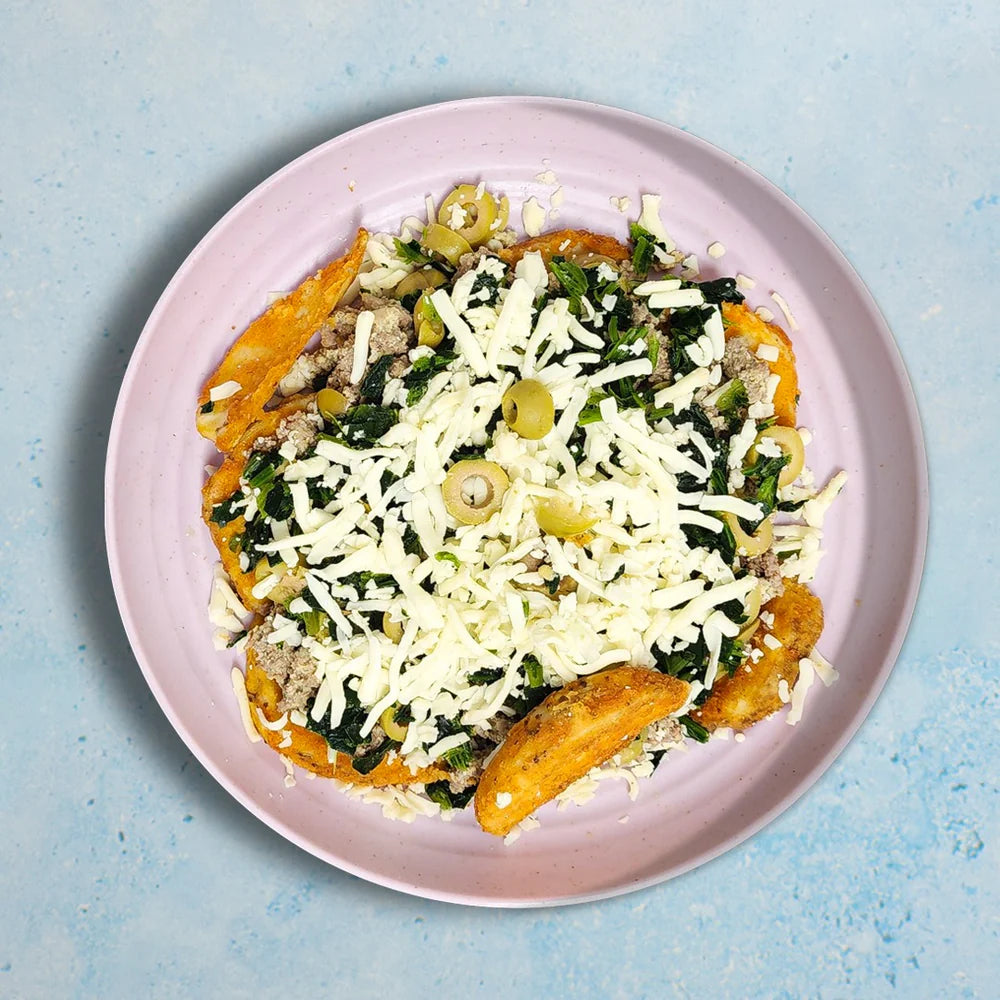 INGRÉDIENTS : Bœuf haché cuit avec des œufs, des jeunes pousses d'épinards frais, des olives vertes, du fromage mozzarella, des oignons et des quartiers de pommes de terre épicés.