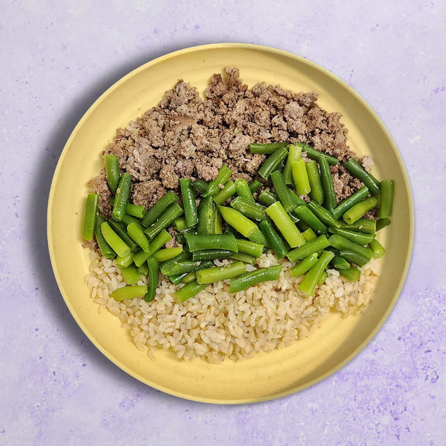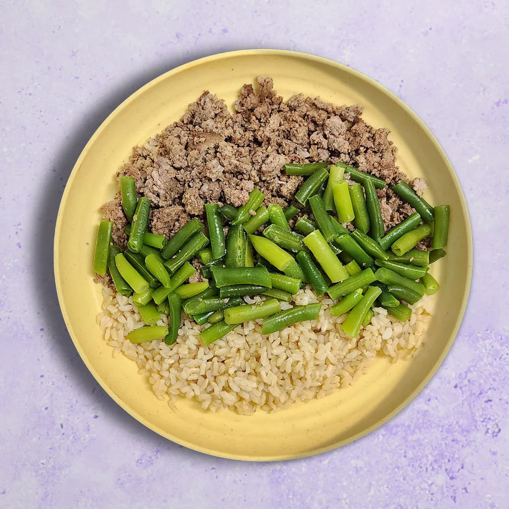 Ingrédients : Bœuf haché extra-maigre, riz brun, haricots verts, sel marin, poivre noir, épices et huile d'olive.