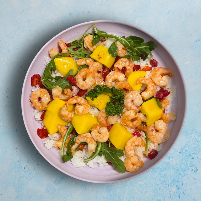 Ingrédients : Crevettes, mangues, poivron rouge, riz blanc, roquette, persil, sauce thaï, épices et sel marin.