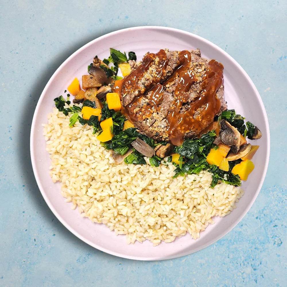 Ingrédients : Bœuf haché extra-maigre, riz brun, champignons, courge, épinards, sauce barbecue, sel de mer, poivre noir et épices.